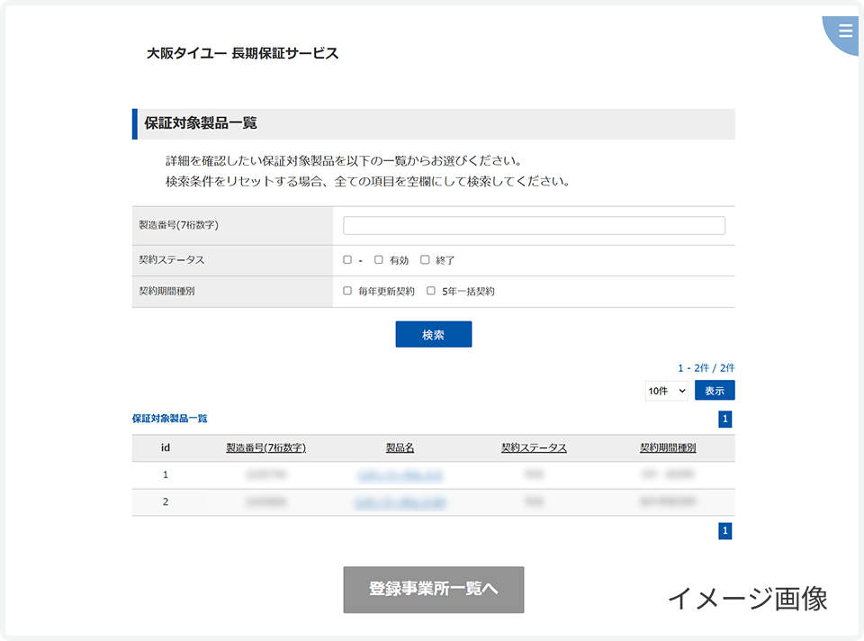 ページ上部では「製造番号」「契約ステータス」「契約期間種別」で検索が可能です。
