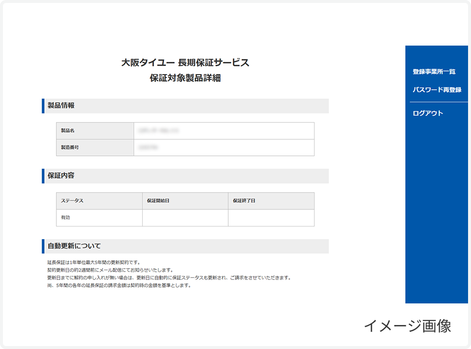 前ページの「id」をクリックすると、ご契約いただいている製品の保証内容の詳細情報をご確認いただけます。